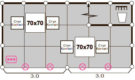 Perimeter walls Carpet Company name on fascia panel 3 chairs 1 table 70x70 3 spot lamp 1 wall element with curtain Waste basket Clothes rack (hanging) 1 socket block 220 V |